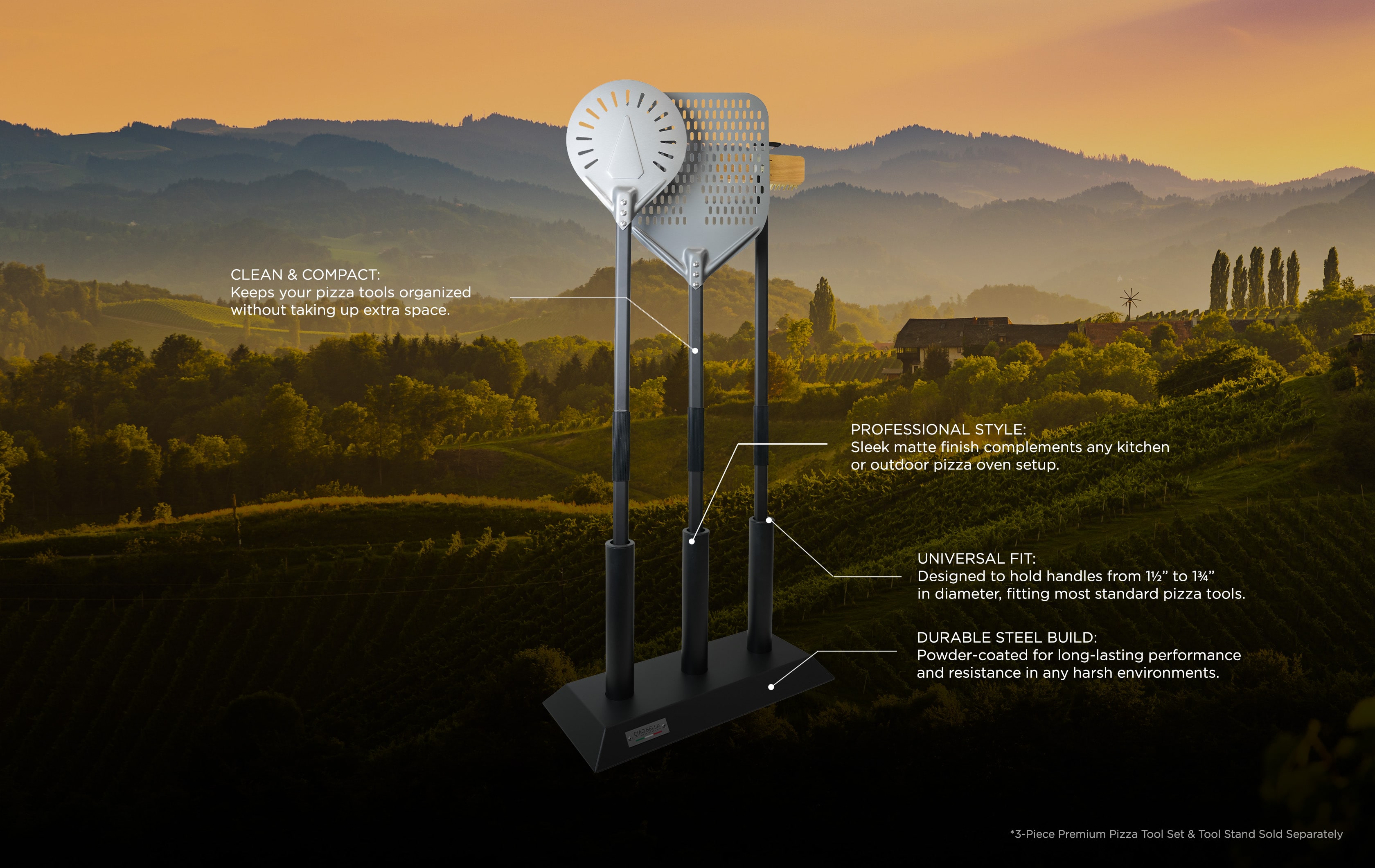 Why You’ll Love ItBuilt from heavy-duty powder-coated steel, this sleek stand combines durability and modern design, making it the perfect accessory for both home chefs and professional pizzaiolos. Keep your pizza peels, brushes, and turning tools standing tall and ready for action. The stable base and universal fit ensure your tools stay protected, clean, and easy to grab during every bake.